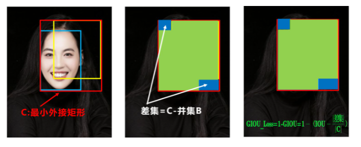 上图中的黄色框为预测框,蓝色框是真实框,则可以求出红色框为它们的并集,蓝底框为它们的差集,IOU为预测框与真实框的交集除以并集,就能求出GIOU_loss。GIoU不仅关注重叠区域,还关注其他的非重合区域,能更好的反映两者的重合度,可以通过最小化GIOU_loss来使预测框和真实框不断靠近。