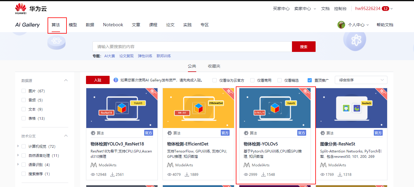在AI Gallery的数据中搜索“检测”,就能搜索到适合目标检测算法的训练集,可以点击helmet训练集。