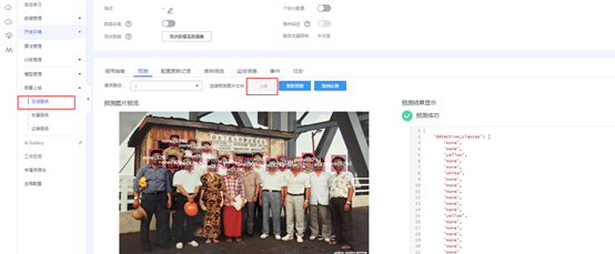模型导出成功后,选择在线服务来进行部署,选择模型后就能上传本地文件来进行预测。