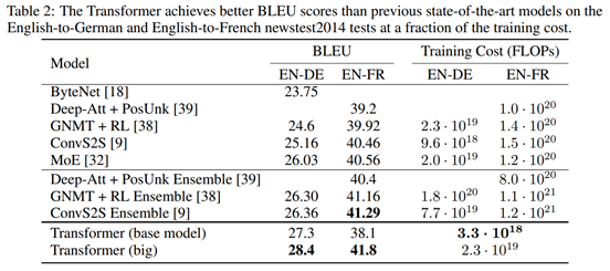 实验中,作者在newstest2013和newstest2014上训练模型,并测试了模型在英语-德语、英语-法语之间的翻译精度。实验结果显示,Transformer模型达到了State-of-the-art精度,并且在训练开销上比已有方法低一到两个数量级,展现出了该方法的优越性。