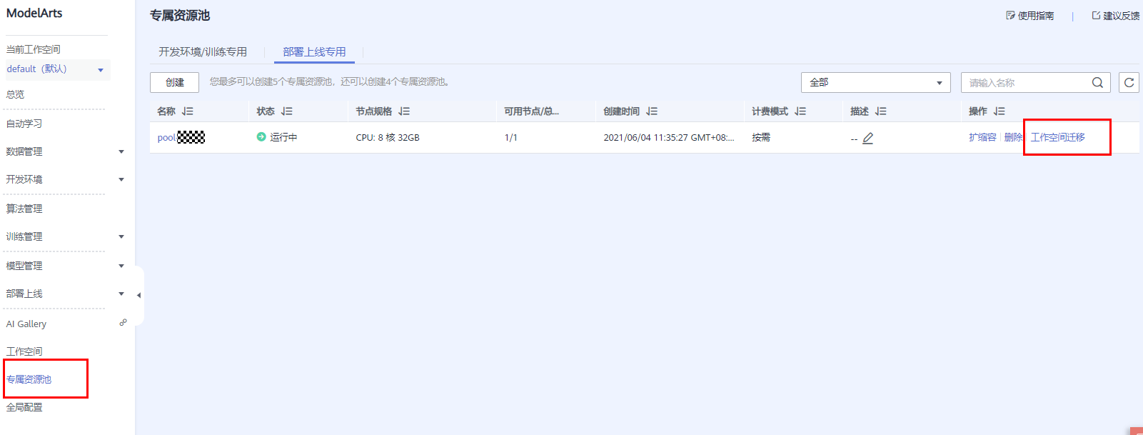 例如我创建了一个专属资源池,我们当前可以看到工作空间迁移这个选项