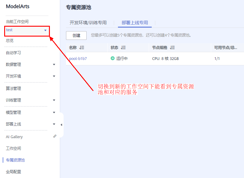 选择确定以后,专属资源池和服务就转移到了目标工作空间