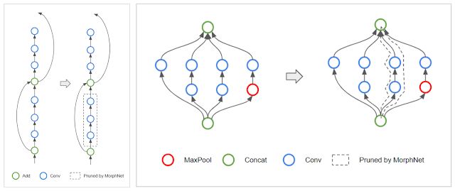 左:MorphNet 移除 ResNet 网络中的残差模块。右:MorphNet 移除 Inception 网络中的并行分支。