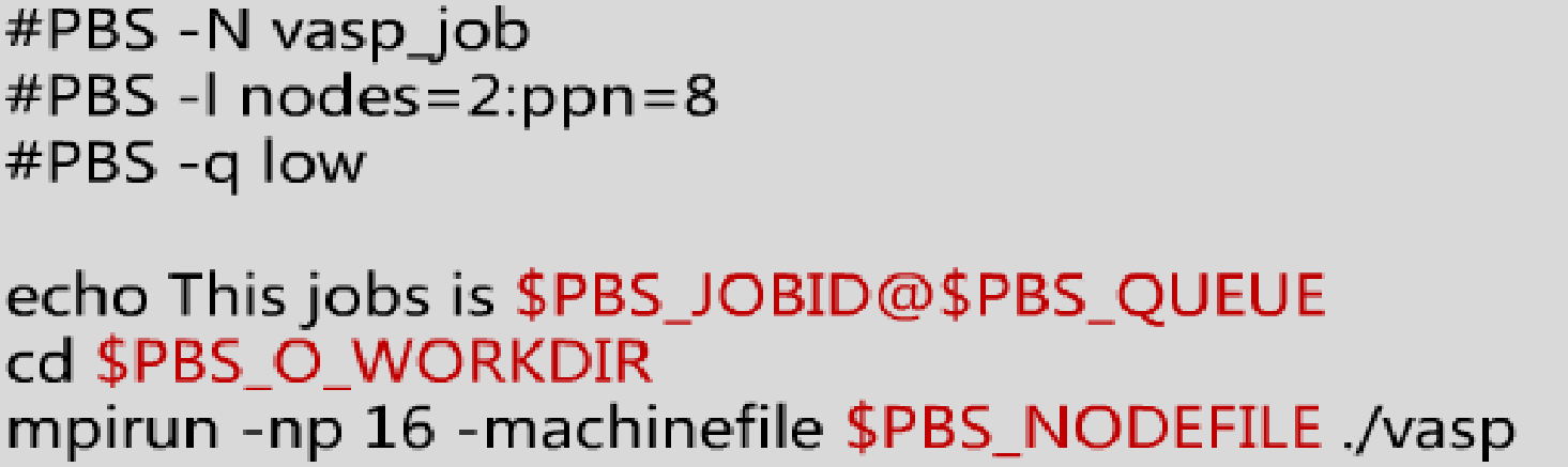 注意上述的例程,是一个非并行接口的程序。如何在PBS脚本内定义一个并行接口程序(MPI),需要参照 MPI 软件的编程规范。