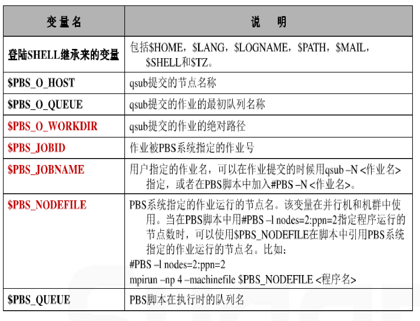这个PBS脚本是标准的 Unix/Linux shell 脚本,在最开始的地方包含了一些看似额外的注解行。 这些注解行都是以#PBS开头,定义了PBS的一些指示符。最重要的一些PBS指示 参见下表: