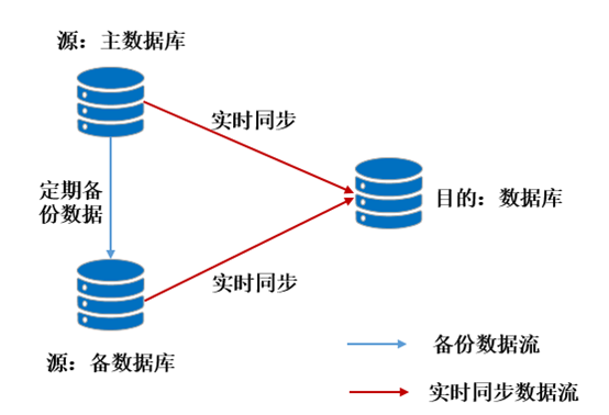 类似以上既有主库也有备库的情况,若要做数据的实时同步,则主库和备库都需要将数据实时同步到目的地,避免因为主库的备份动作导致目的端数据误删、重复等与源端产生不一致,如下图所示: