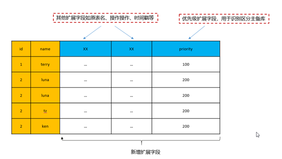 为了解决上述源库有主备的情况,可在以上扩展字段的基础上再增加一个扩展字段,如优先级字段,规定若源库为主数据库,优先级字段值为“100”,若源库为备数据库,优先级字段值为“200”,则目的端在处理来自源端同步过来的数据时,在原处理基础上增加以下处理逻辑:
