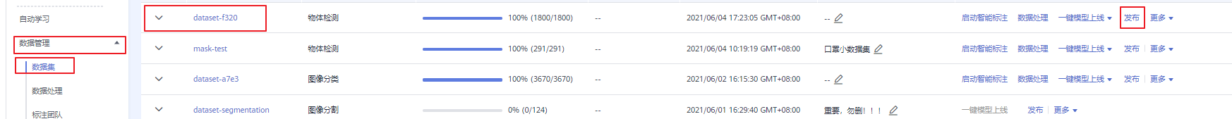 下载好的数据集是默认训练验证集切分比例为1.00,要输入到AI Gallery的Yolov5算法中需要进行切分。在“数据管理”的“数据集”中选择对应数据名称的“发布”。