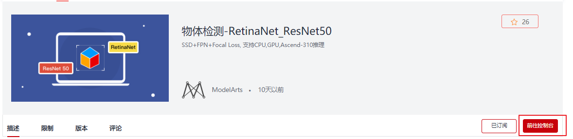 在算法中选择物体检测-RetinaNet_ResNet50,订阅后前往控制台。