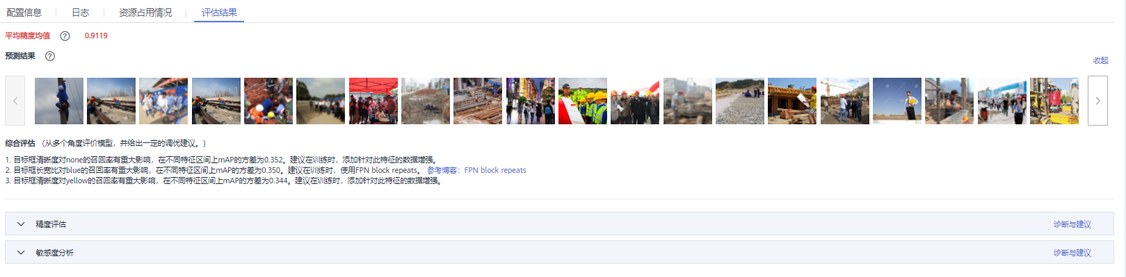 训练完毕后可看训练作业的评估结果,以及精度评估和敏感度分析。