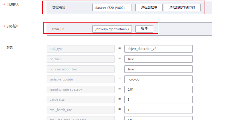 创建训练作业后只需要填写数据输入和模型输出train_url,超参数据可以选择默认值,也可以根据实际情况修改,创建完毕后点击“提交”。超参数据修改可参考:https://marketplace.huaweicloud.cn/markets/aihub/modelhub/detail/?id=d965a19d-62e6-4a07-bb02-3db57ccf9c98