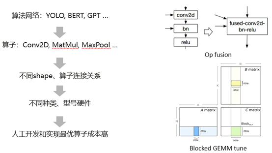 于此同时,我们现在有非常多的算法网络,比如说YOLO, BERT, GPT等等。而这些算法网络是是由不同类型、不同shape,不同连接关系的算子组成的。最终它们又运行在不同种类和型号的硬件上面。这就导致人工去为每个场景开发和实现最优算子成本很高。这里举了两个例子,如图 2所示,算子融合是一个常见的性能优化方法,在融合之前,每个算子计算前后都需要把数据从内存读到缓存,再从缓存写回到内存。而融合之后,可以避免算子之间内存读写从而提高性能。传统的做法就是人工去根据算子连接关系开发融合算子,但是不同网络不同类别算子连接关系几乎不可能完全枚举。另一个例子就是算子调优,算子实现过程有很多参数会影响性能,但是传统人工算子开发方式很难去表达和维护这些参数,并且对这些参数进行调优从而实现不同shape和硬件的最优性能。