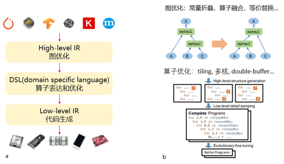 最后介绍下业界已有的编译器项目。目前生态最完善,开源的,框架不依赖的项目首推TVM,已经被很多公司所采用。TVM流程如如图 3a所示,TVM可以导入各个框架的模型,例如TensorFlow pb,onnx,TorchScript等模型,统一用TVM称为Relay的High level IR进行表示。IR中每个算子采用了Tensor expression的DSL来进行计算描述和调度。这个DSL采用Einstein’s notation的方式进行算子的compute描述,算子compute一般体现为多重for循环。然后基于Halide思想使用schedule对这个多重for循环进行各种变换,例如循环合并,split,顺序变换等等。最后,lower到low-level IR生成具体的device代码并进行推理。