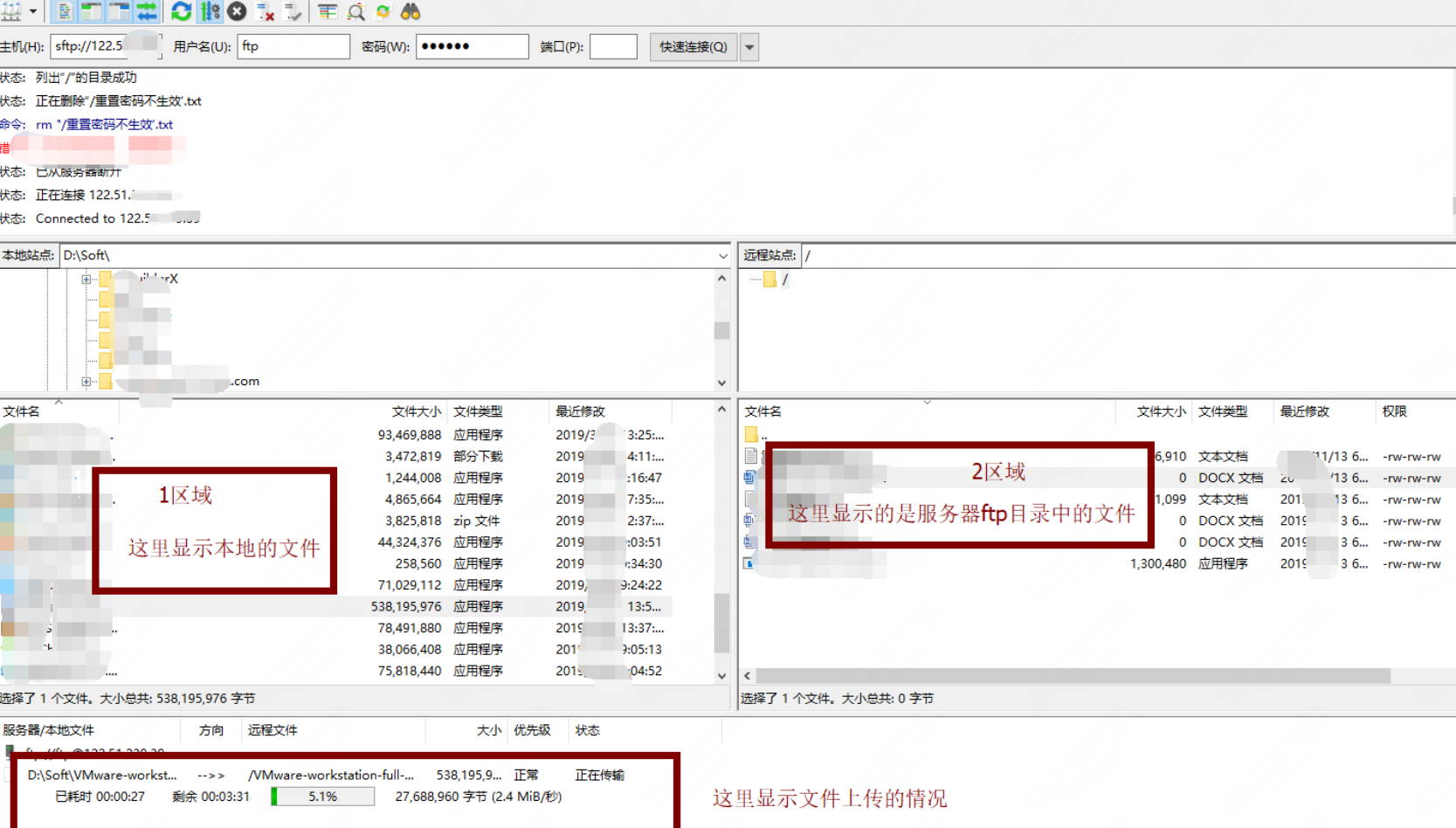 如果需要将本地的文件上传到服务器或者将服务器的文件下载到本地,在1区域或者2区域找打文件后鼠标右键点击【上传】或者【下载】按钮即可。
