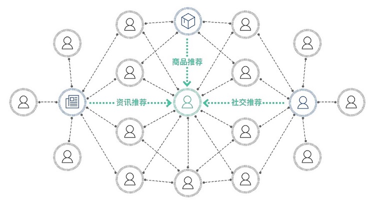 基于图数据库,知识图谱扩展了各种商品的关联属性(商品的各种维度、这些维度属性的喜好度、商品的社会化评价等),由于扩展了用户与商品之间存在的隐藏关联关系,补充了用户与物品的交互数据,基于人-人关联,实现人-物关联。因此可以更进一步提升推荐效果。