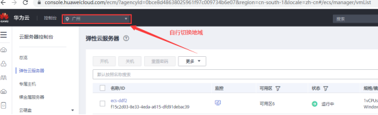控制台快速入口:https://console.huaweicloud.cn/ecm/?agencyId=0bce8d48638025961f97c009734b6e07®ion=cn-south-1&locale=zh-cn#/ecs/manager/vmList