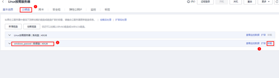 10,在弹性云服务器列表---找到Linux按需云服务器---点击实例ID----找到云硬盘----卸载数据盘。