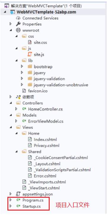 Web应用程序创建的项目:我们有 Controllers、 Models和 Views文件夹。在 Views文件夹中,已经内置了示例视图文件和布局文件,它们代表Web应用程序的用户界面。在 wwwroot文件夹中还有包含Web应用程序通常需要的 JavaScript文件、CSS文件,以及前端网页需要依赖的组件包或资源文件。