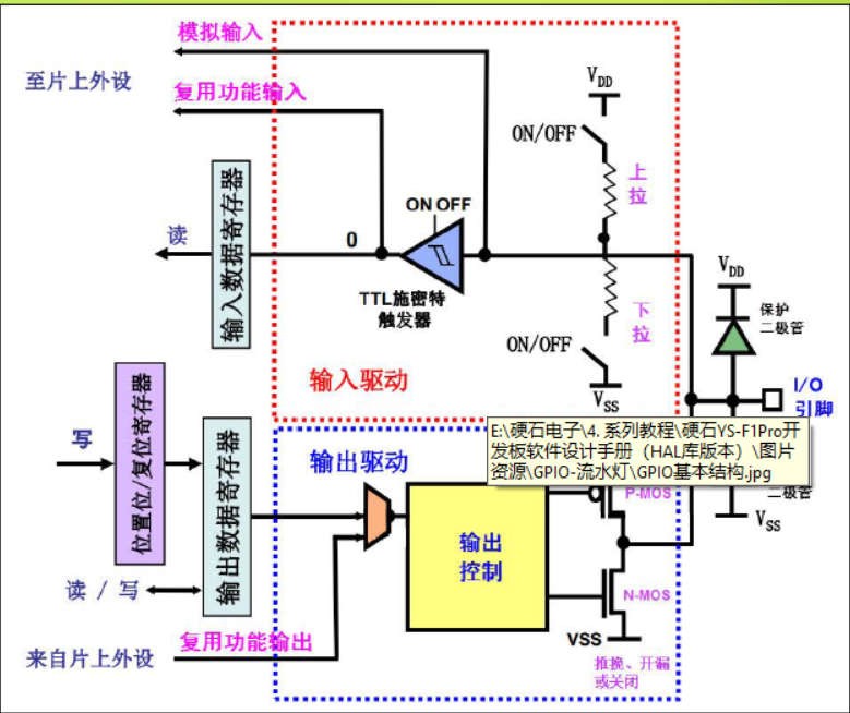2、接口特点:IO口内部有这个一套复杂的切换电路来切换这些工作模式,电路IO拓扑如下图