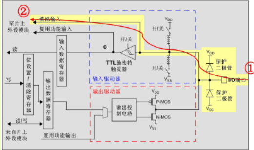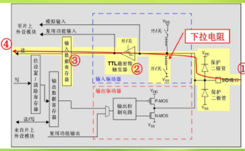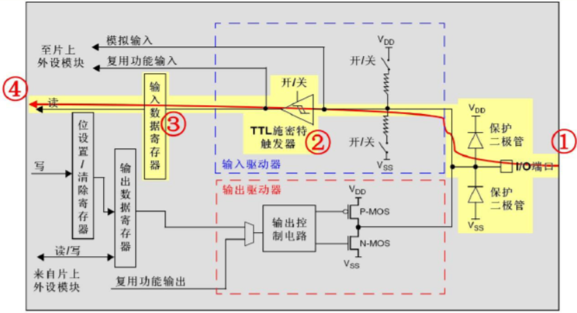 IO信号通过引脚输入到施密特触发器,经过时钟捕捉单元,信号锁存在输入信号寄存器中,被MCU获取到状态