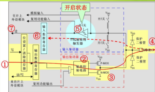 输出时通过MCU吸入到IO位基础其,再通过写操作将信号通过时钟写入到输出寄存器,最终通过输出短的MOS管进行信号放大输出。