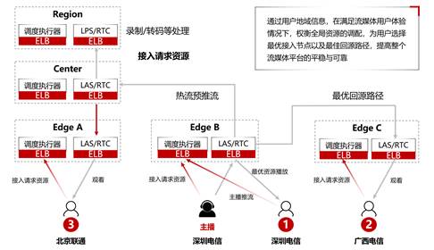 而以现在的架构,如果有一个观众是深圳电信的用户1,通过动态的架构会把他实时调度到和主播推流节点相同的节点上来,他的访问路径是主播到B节点,然后再到观众,其实就经过了一条,整个链路的质量和成本都能得到很好的提升。对于广西电信的一个用户2,如果把他直接调度到推流点,整个网络将不可控,那么动态智能网状架构会把他接入到就近的节点上。因为B到C之间的网络相对是可靠性更高一些,调度系统判断这一块的访问质量是可行的,所以用户2的访问路径是2-C-B,经过两点。而如果是北京连通的用户3,主播跟观众是天南海北的,这种情况下做就近的访问可能对质量的损害会比较大,则还是会按照原有的方式去拉流,保证高质量的访问。
