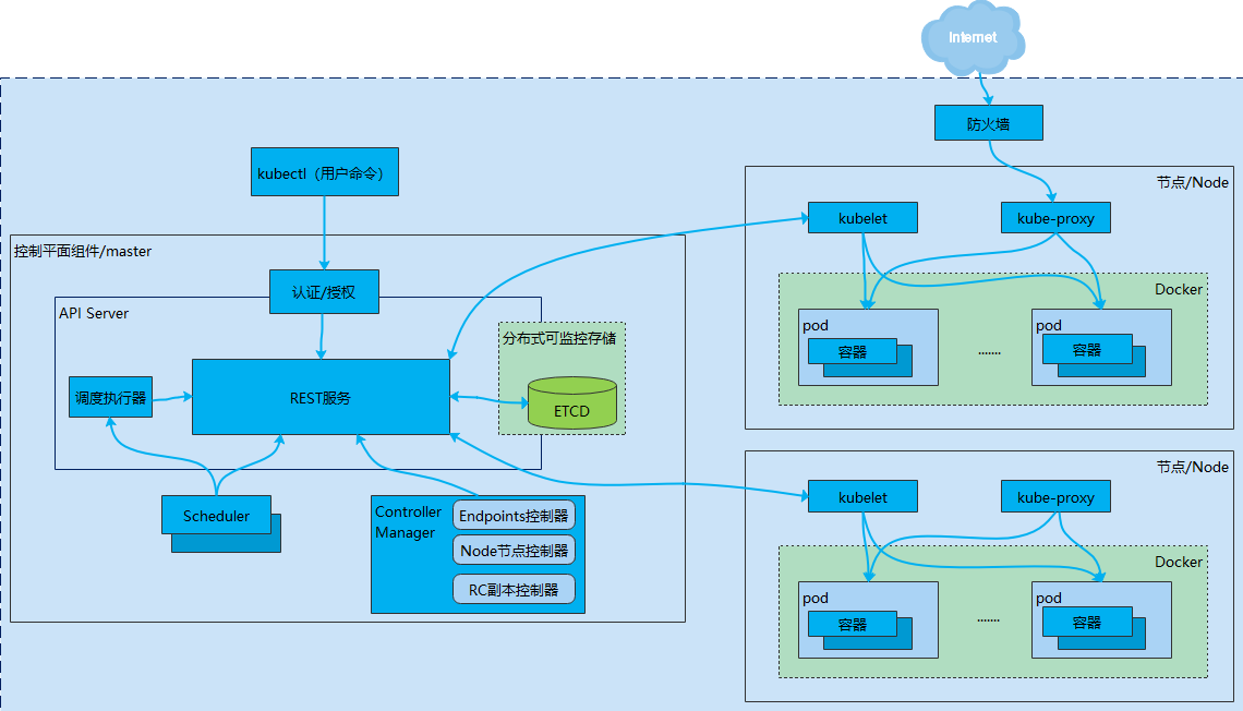 对应的虚拟机VM或物理机,一个Node节点就是一台虚拟机VM或物理机,是容器运行的载体,多个Node节点组成一个集群;安装有控制平面组件的节点就称之为master节点:集群的控制中心。