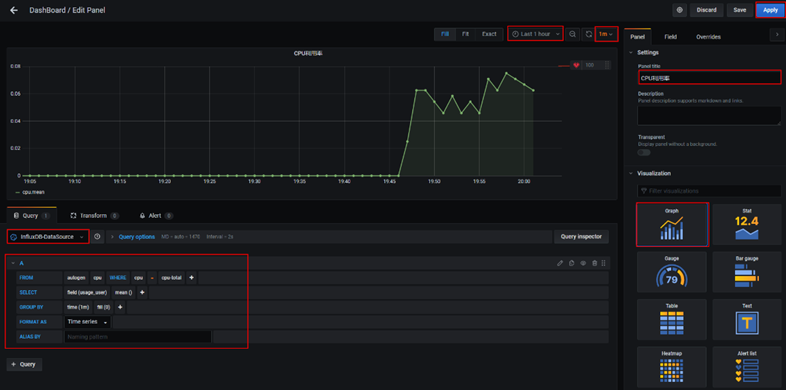查询语句配置如下(以展示服务器CPU利用率为例,从时序数据库的表cpu中查询usage_user,按1m的分组时间间隔求平均值,时间线是cpu=cpu-total):