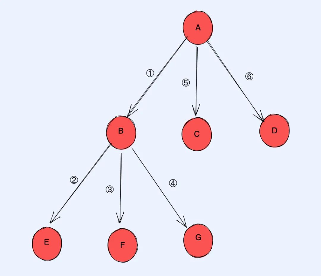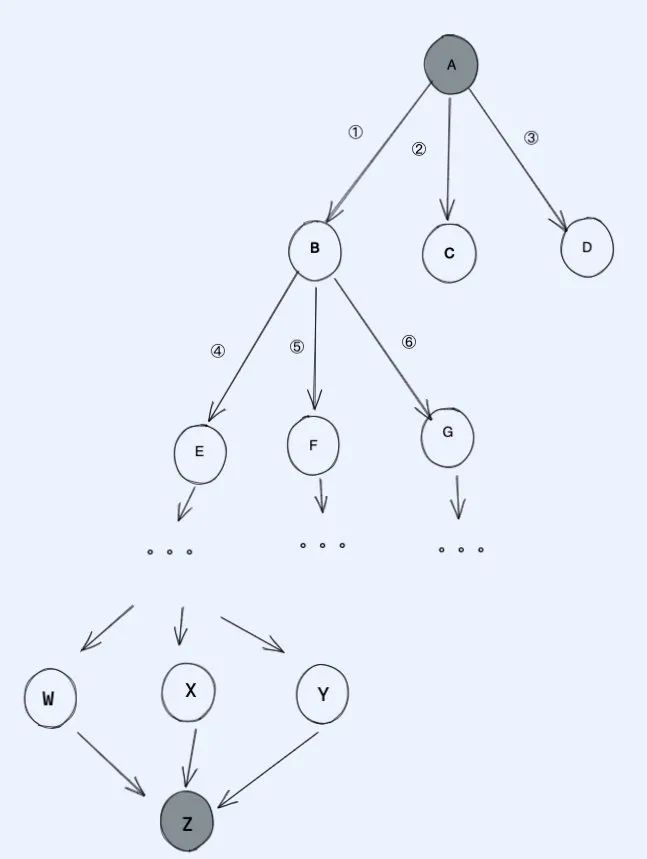 如下图,我们遍历到 A,有三个选择。此时我们可以任意选择一条,比如选择了 B,程序会继续往下进行选择分支 2,3 。。。