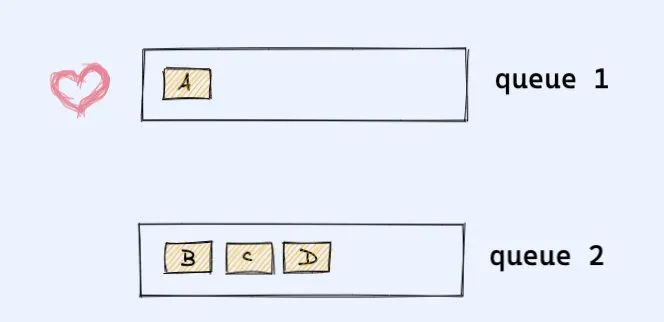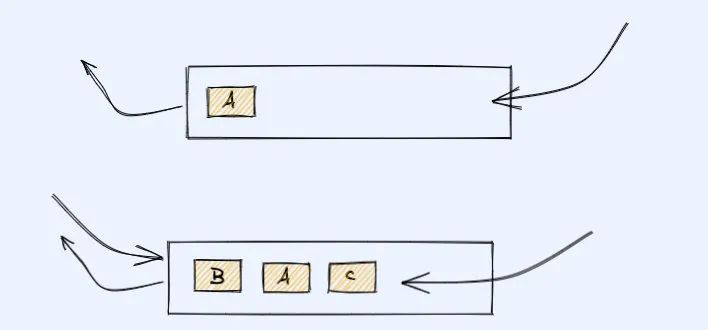 上面的队列是普通的队列。而下面的双端队列,可以看出我们在队头插队了一个 B。