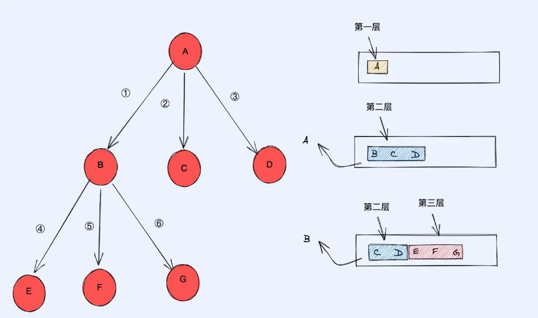 可以发现,和我上面说的一样。右侧的队列始终最多有两层的节点,并且相同层的总在一起,换句话说队列的元素在层上「满足单调性」。