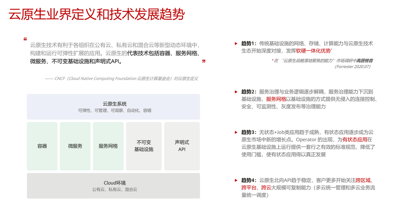 十年云计算浪潮下,DevOps、容器、微服务等技术飞速发展,云原生成为潮流。2020年华为云在业界率先提出了云原生2 .0的理念。云原生2.0是企业智能升级新阶段,企业云化从“ON Cloud”走向“IN Cloud”,成为“新云原生企业”,新生能力与既有能力立而不破、有机协同,实现资源高效、应用敏捷、业务智能、安全可信。