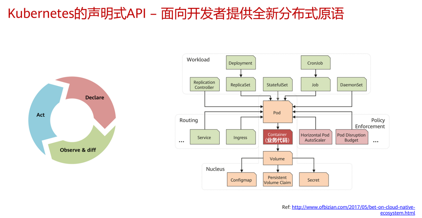 声明式API在这种大型的分布式系统非常有利于收敛的趋向于稳定的状态,kubernetes 在API采用的是对象互补组合的模式,区别于继承模式,好处是业务运行和资源调度的核心单元,实际上就是容器中运行的核心代码,围绕着向针对着的不同的视角,比如说是定义部署这个业务,kubernetes提供了这种Workload多种类型的抽象,让用户有直观的感受,结合业务的相关特点去定义Workload的类型,针对向应用,业务对外提供服务有像Service和Ingress这样的API帮你去定义这个服务,数据交互层面的特征。
