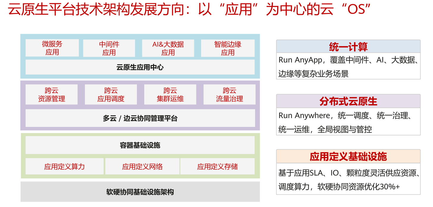 从底层有非常多的容器,云原生存储,云原生网络,以及硬件加速方案进行选择,如果面向用户,面向业务,kubernetes的北向可以运行和对接业界各种主流的数据库、中间件、CI/CD工具链等等