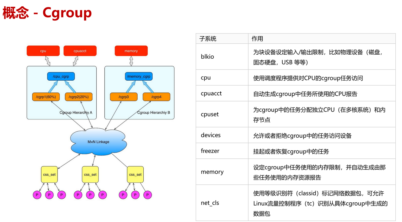 Cgroup              其名称源自控制组群(control groups)的简写,是Linux内核的一个功能,用来限制、控制与分离一个进程组的资源(如CPU、内存、磁盘输入输出等)。