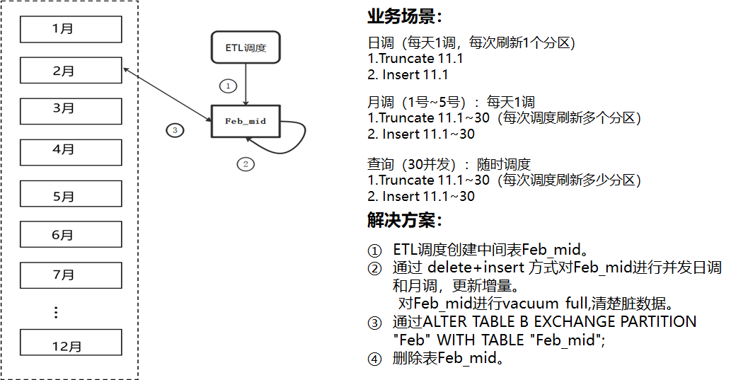 具体实现方式简单理解为,调度将数据写入与目标表相同表结构的临时表B中,数据写完之后,通过交换分区语。用临时表的数据置换目标表对应的分区。这种方案能只在交换分区的时候会加锁,在数据库底层其实是重新指定分区表的分区地址,速度特别快,对查询的业务影响能降到最低。