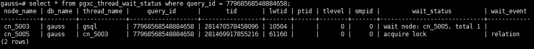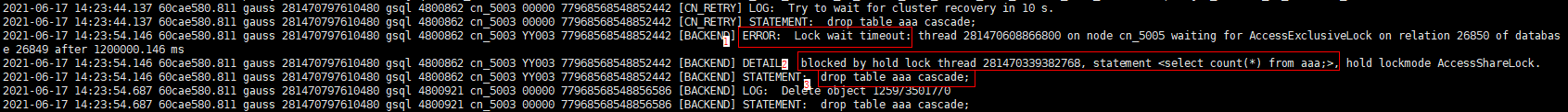 连接CN_5005节点CN,执行select pg_terminate_backend(pid); 返回t,可重新执行目标语句。若执行成功,说明持锁语句全被清除,若仍无法执行出结果,可参考如下操作。