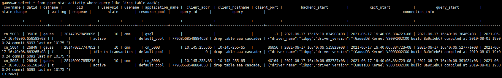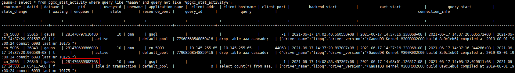 select * from pgxc_stat_activity where query like '%aaa%' and query not like '%pgxc_stat_activity%';(红色字体手动替换为对应关键字)