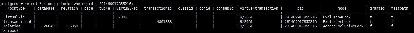 3.连接对应实例,执行select * from pg_locks where pid = 281469917855216 对应等待视图的tid;granted为f的是等锁状态,t为持锁状态;如下图等锁的relation为26850。