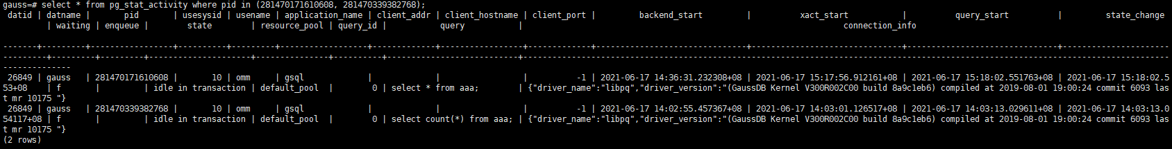 5.select * from pg_stat_activity where pid in (281470171610608, 281470339382768);替换为granted为t的pid。