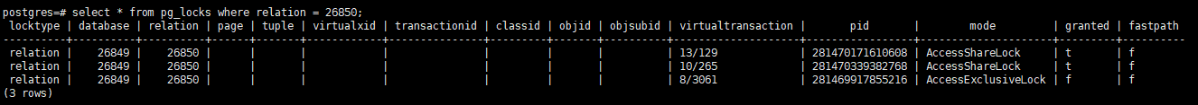 4.在执行select * from pg_locks where relation = 26850;可以发现该实例有两个语句持锁。