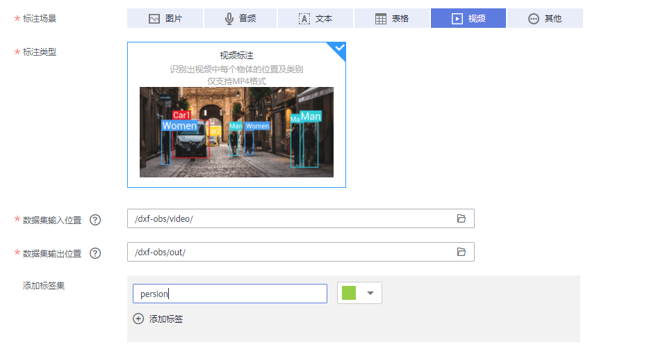 - 创建视频数据集,输入路径选择从Gallery下载数据的位置。并添加"person",“car”的标签