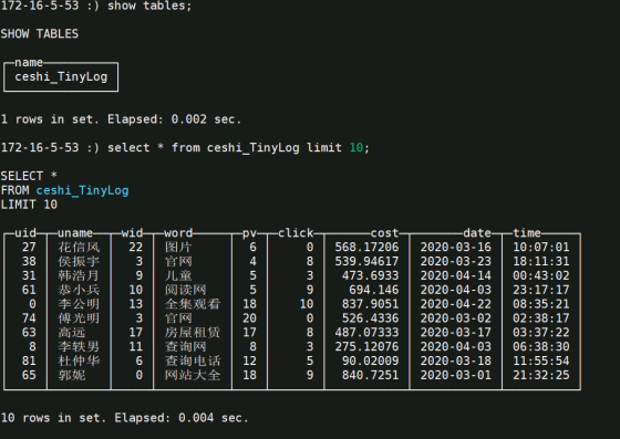 建表:CREATE TABLE ceshi_TinyLog(uid Int64,uname String,wid Int64,word String,pv Int64,click Int64,cost float,date Date,time String) ENGINE=TinyLog;