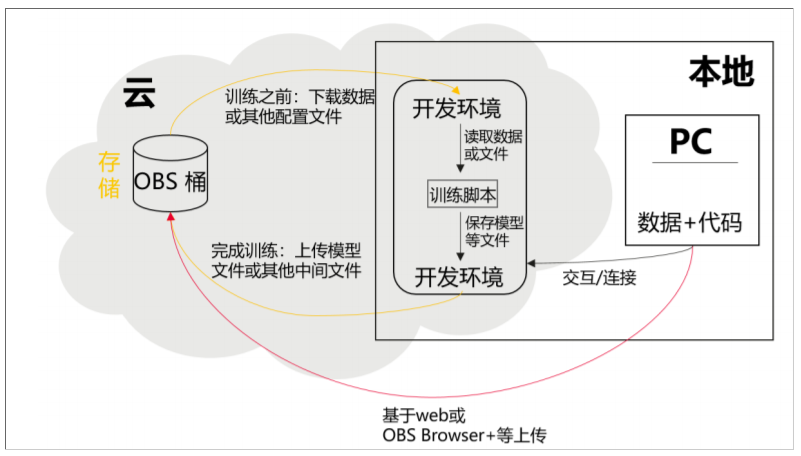 ModelArts的Notebook可以视作是本地PC的延伸,均视作本地开发环境,其读取数据、训练、保存文件等操作与常规的本地训练一致。