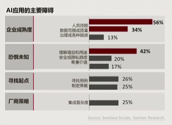 上图是Gartner的一份研究报告。它从四个维度分析了AI应用的主要障碍。其中最主要的3点: