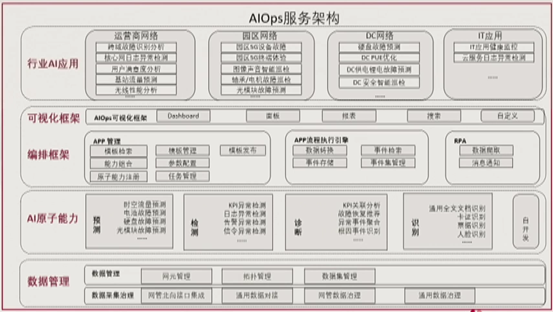 上图是AIOps服务的整体框架。AIOps从下到上分成了四层: