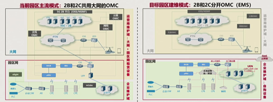 2B和2C共用大网的OMC:当前的主流模式。企业去租用运营商的无线设备及其他的一些设备。这种模式的问题在于,终端由企业维护,网络由运营商维护,那么出现问题的时候很难分清责任;另外一个问题是,运营商侧的运维能力和组织构筑大网2C的O域,难以支撑企业内网高SLA,强化客户诉求。