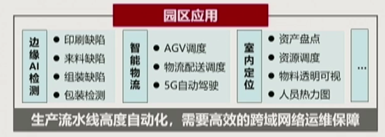 上图列出了园区里面常见的一些应用,包括边缘的AI检测、智能物流、室内定位等。所有的这些业务其实都和上一张图类似,即任何一个简单的业务都要涉及到多个域的参与。