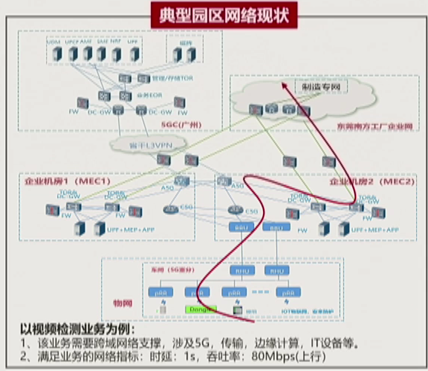 上图是一个园区比较常见的一个视频检测的业务。我们可以看到,即便是一个最常见的业务,也大概十来个网元都会参与到其中,从5G的无线到传输到边缘计算,甚至是核心网,都会去参与其中。