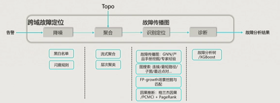 - 识别定位:结合Topo、故障传播图,对每个告警组进行分析,识别出每个告警组中有几个故障,每个故障的根因网元和根因告警;